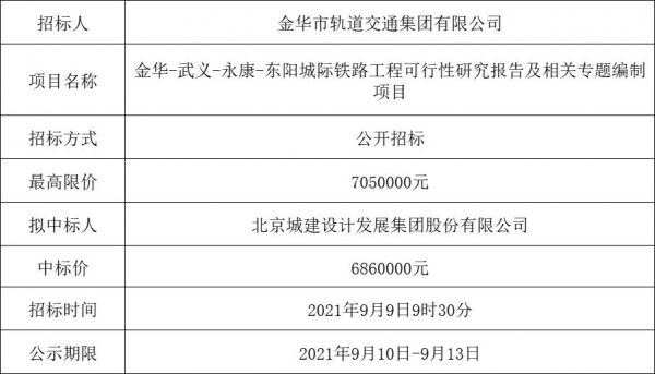金華-武義-永康-東陽城際鐵路工程可行性研究報(bào)告及相關(guān)專題編制項(xiàng)目中標(biāo)公示