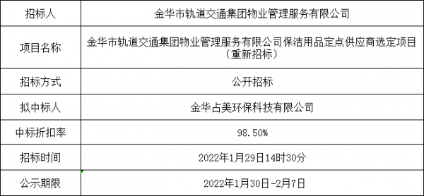 金華市軌道交通集團物業(yè)管理服務(wù)有限公司保潔用品定點供應(yīng)商選定項目的中標公示